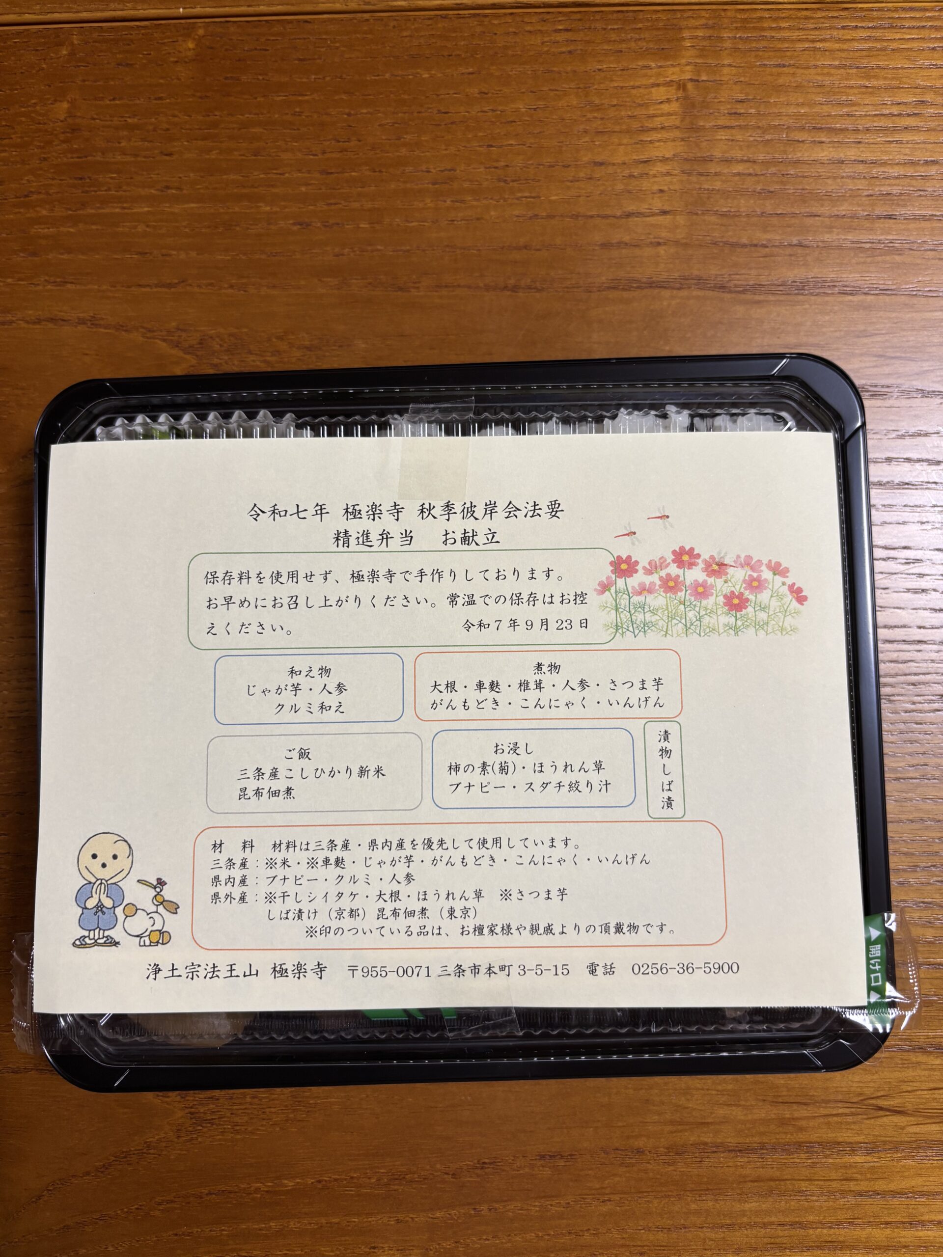 精進弁当をお申込いただいた皆様に、お弁当をお持ち帰りいただきました。今回も15日には用意した数に達し、お楽しみいただいている様子が感じられ、それを励みに心を込めて調理いたしました。