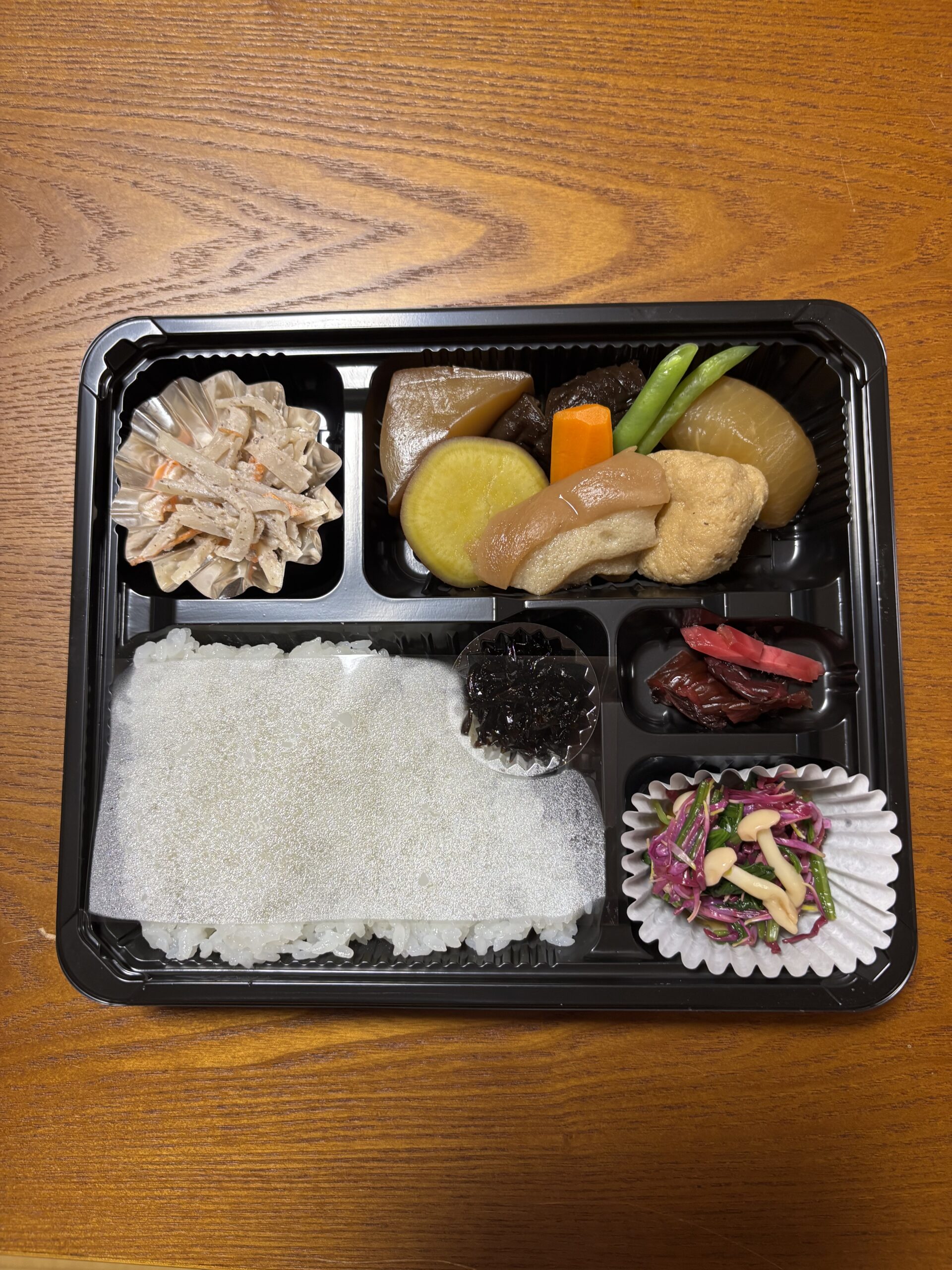 コシヒカリの新米、菊のお浸し、さつま芋が入った煮物、極楽寺名物、ジャガイモと人参のクルミ和えなど盛りだくさんの秋のお彼岸弁当になりました。
