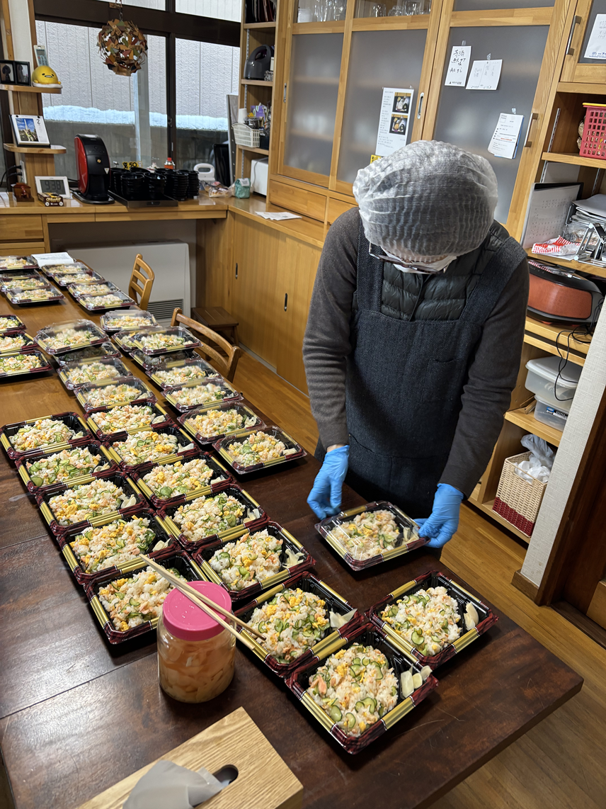 昨日から下準備をして、朝8時から40個の鮭のまぜ寿司、お吸い物、白菜漬け、紅白なますをご用意したしました。