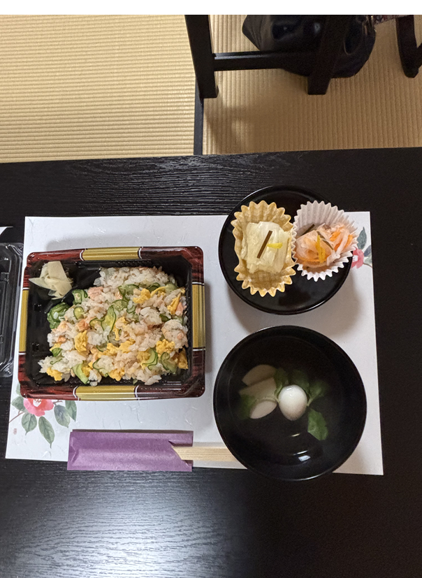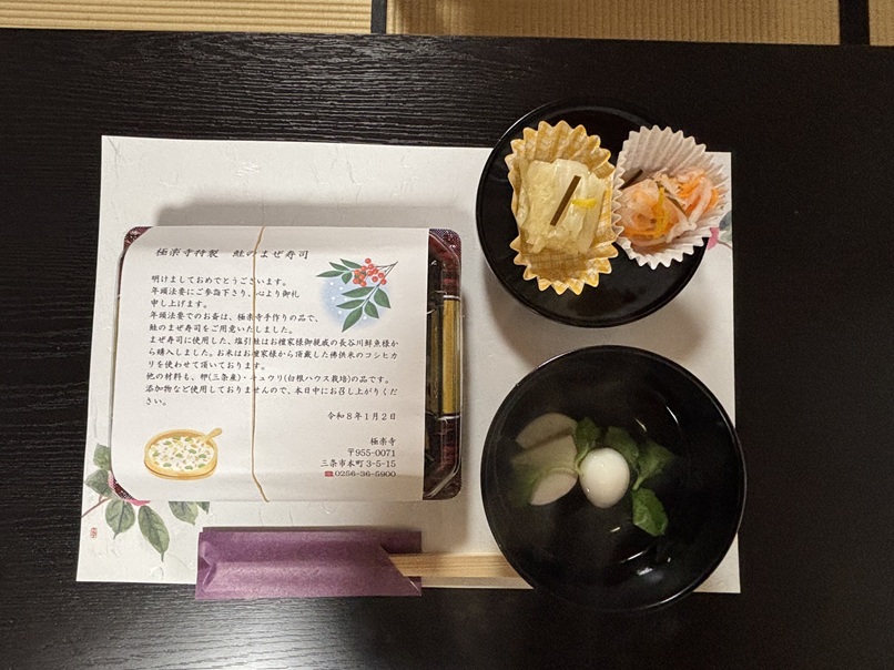 法要後には、お吸い物、鮭のまぜ寿司、お漬物で簡単なお食事をお召し上がりいただきました。