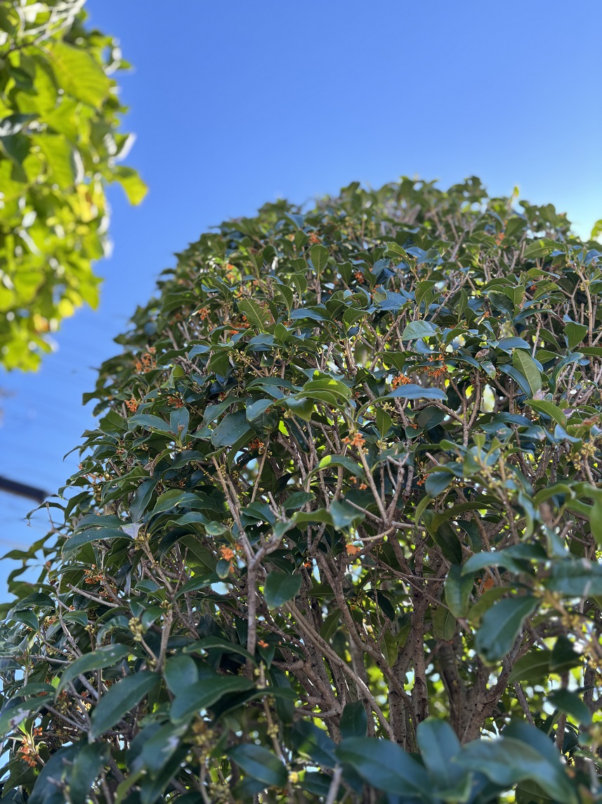 今年の金木犀は開花が遅く、先週末にようやく少し開花しました。