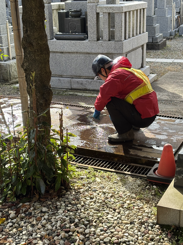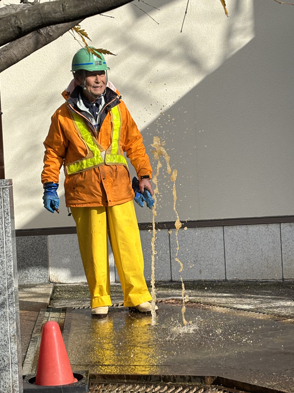一年ぶりに流す地下水は、茶色く濁り30分ほど出し続けてパイプのつまりがないことを確認してから、一つずつノズルをチェックしていきます。気温が10度ほどでしたが、日差しがあり、カッパを着ている作業員は暑いようでしたが、水をかぶるのでこの格好でないとだめだそうです。