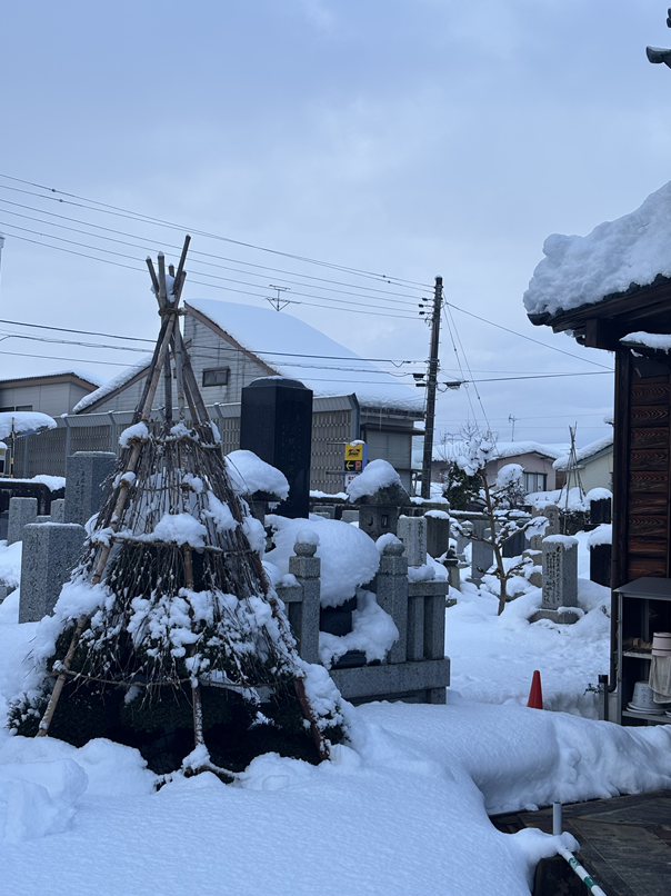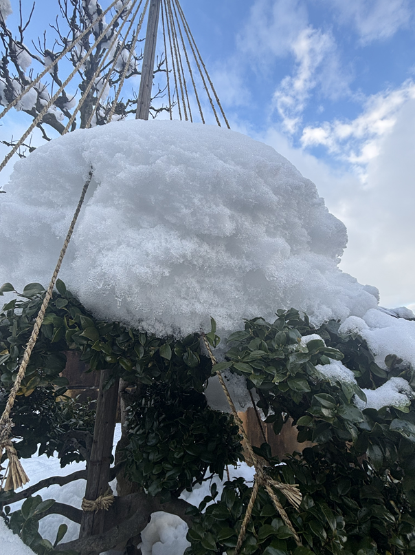 境内の樹木は雪つりや冬囲いがあり、枝も折れずに何とか頑張っています。冬囲いをしてもらって樹木もつぶれずに春を迎えられるはずです。