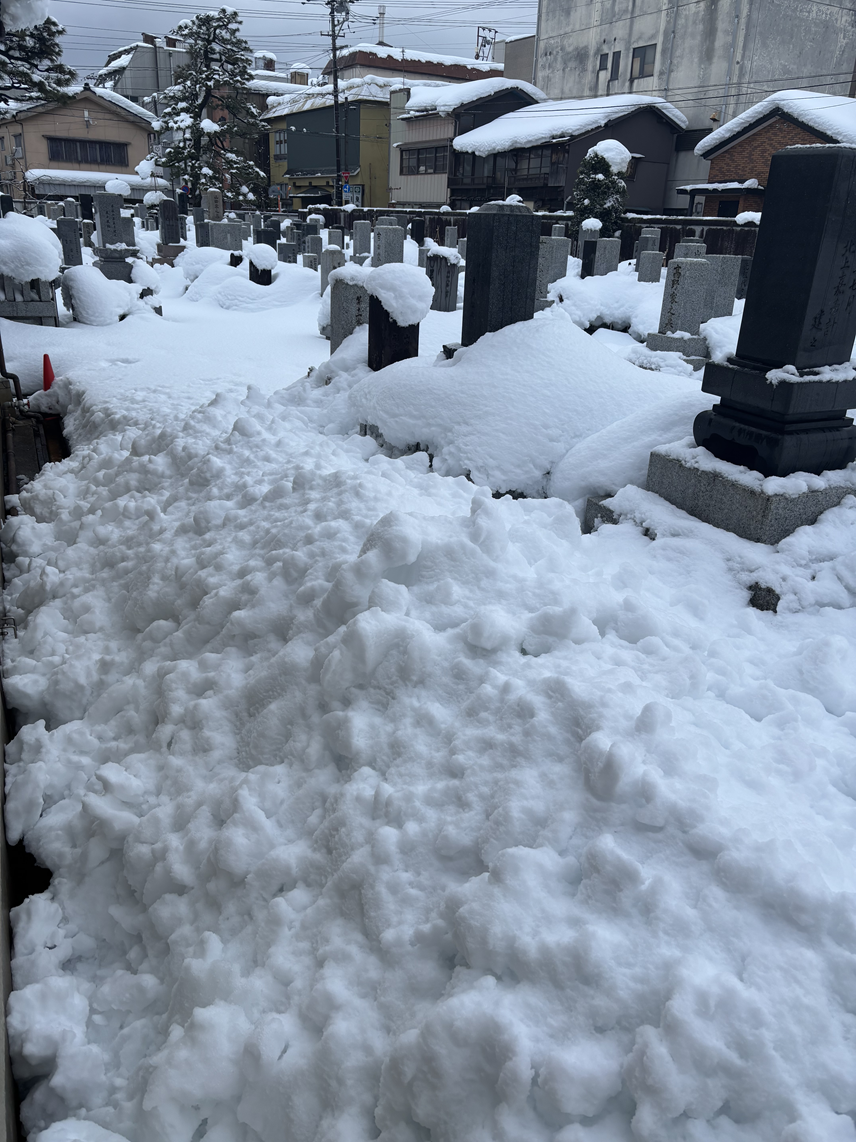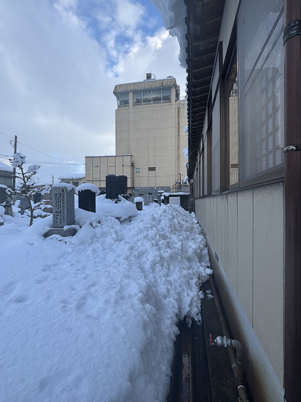 墓地のある南側は日が当たると滑り落ちて、下にたまっています。墓地はすっぽり雪の中です。墓地に入ることはできませんから、お墓参りは雪解けまでしばらくお待ちください。